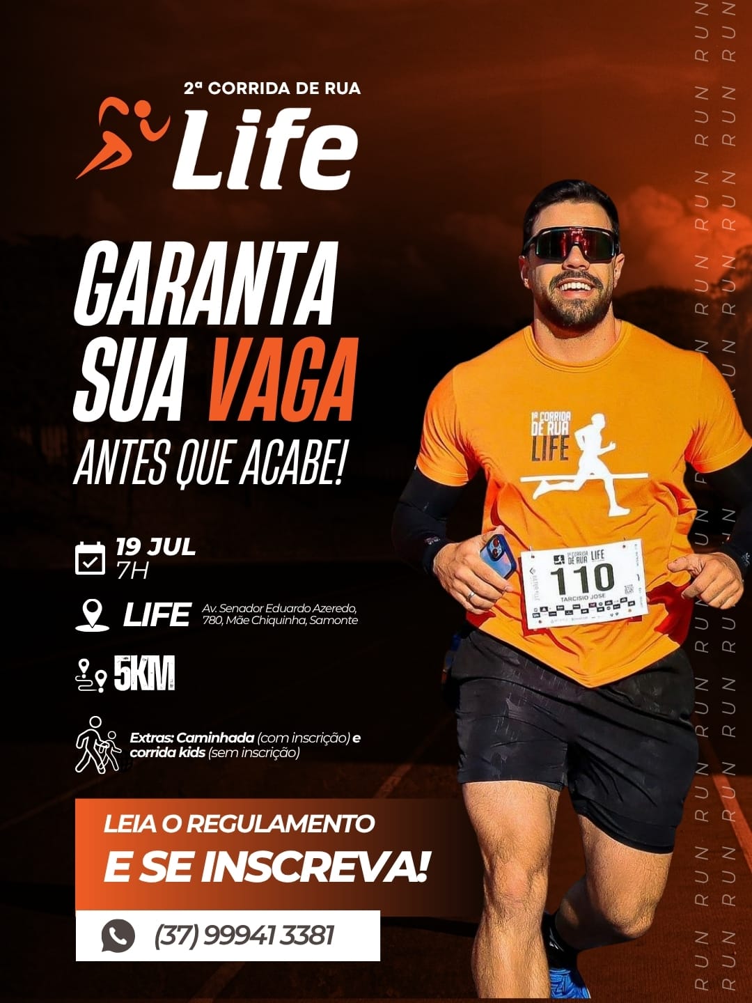 A CORRIDA SERÁ REALIZADA NO DIA 19 DE JULHO DE 2026 COM LARGADA AS 7:00am NA PORTA DA ACADEMIA LIFE SITUADA NA AVENIDA SENADOR EDUARDO AZEREDO N°780 MAE CHIQUINHA. SENDO UM ÚNICO PERCURSO DE 5 KM. HAVERÁ STAFF, PONTOS DE HIDRATAÇÃO E MARCAÇÕES COM SETAS PELO PERCURSO. INSCRIÇÕES: R$ 65,00 REAIS, (+TAXA SITE) A LARGADA E CHEGADA SERÁ NA PORTA DA ACADEMIA LIFE. PREMIAÇÃO GERAL PARA OS 5 PRIMEIROS COLOCADOS MASCULINO E FEMININO. RECEBERÃO TROFÉUS OS 3 PRIMEIROS COLOCADOS EM CADA FAIXA ETÁRIA. FAIXAS ETÁRIAS SENDO ELAS: