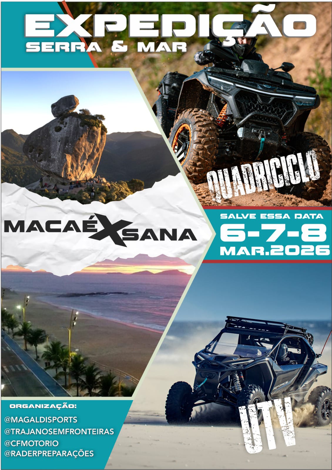 1. O SERRA MAR Sana Macaé, é um passeio de veículos off-road de 4 rodas (ESPECÍFICO PARA QUADRICÍCLOS E UTVs) em terreno de trilhas e também estradas vicinais pela região serrana de Macaé com destino ao Sana, que correrá nos dias 06 , 07 e 08 de Março de 2026 .