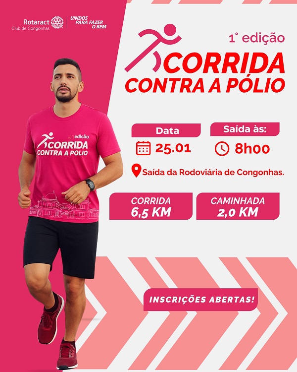 A 1ª Corrida e Caminhada Contra a Pólio é organizada pelo Rotaract Club de Congonhas. O evento acontece no dia 25 de janeiro de 2026, com largada às 8h, na Praça da Rodoviária de Congonhas- MG.