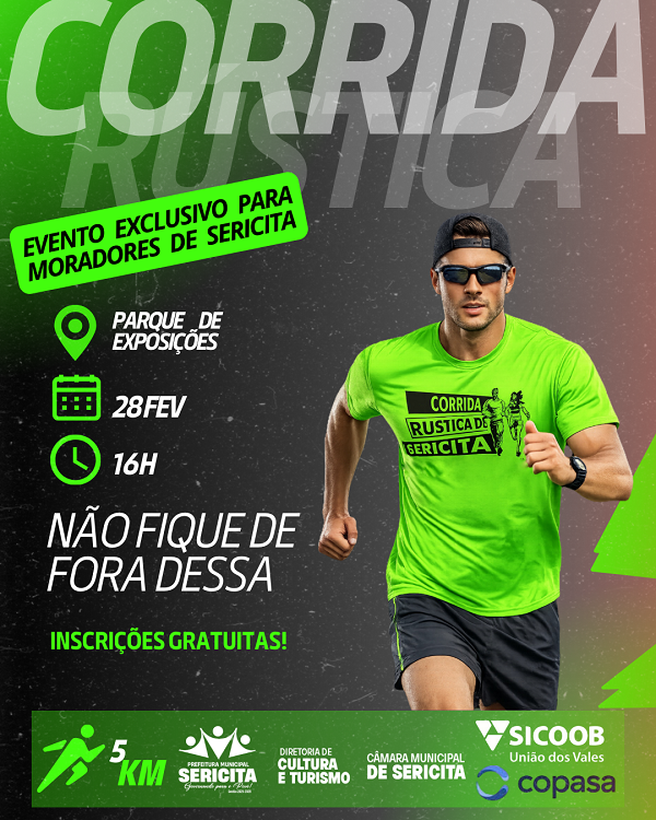 A corrida de rua sendo a CORRIDA RÚSTICA em Comemoração so 63º Aniversário de Sericita, doravante denominada EVENTO, será realizada no dia 28 de Feveveiro de 2026, na cidade de Sericita/MG, com distância única de 5km, independentemente da condição climática.