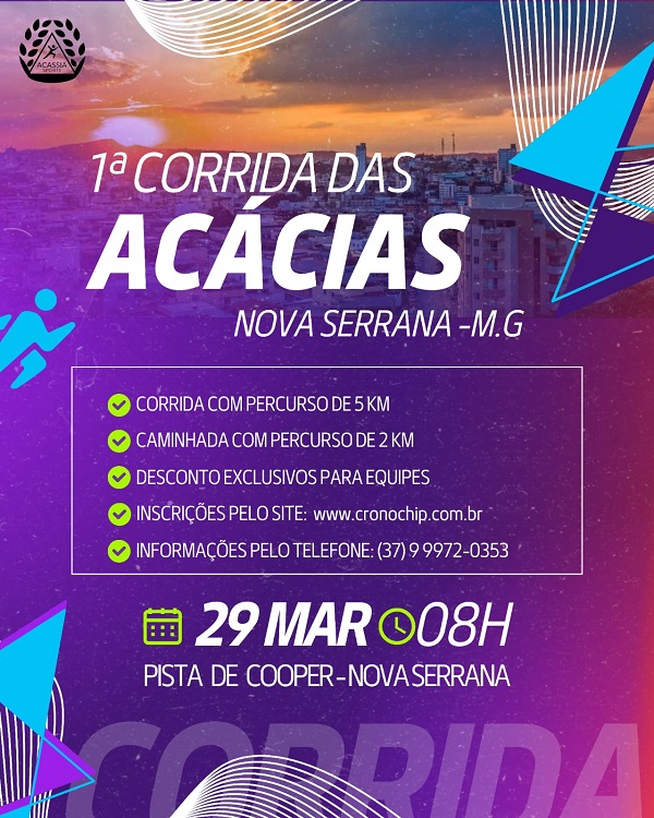 2.1 – Corrida Acácias, será realizada em Nova Serrana para incentivar o esporte nessa cidade e toda região, o Lucro líquido obtido com a realização da corrida Maçônica será integralmente destinado a Associação Acácia de Assistência, com finalidade de ampliar e fortalecer os projetos de beneficência por ela desenvolvidos, incluindo a manutenção, ampliação e suporte ao banco de produtos ortopédicos, bem como para a manutenção e conservação dos prédios utilizados pela Loja Obreiros da Serra nº 238 e pela Associação Acácia de Assistência, reafirmando o compromisso social, solidário e filantrópico do evento.