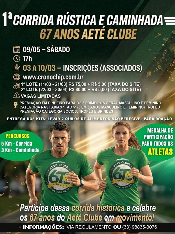Realizada a partir 03/03/2026 pela secretária do clube fone (33) whatspp 32781820, AETÉ CLUBE até 30/04/2026.
