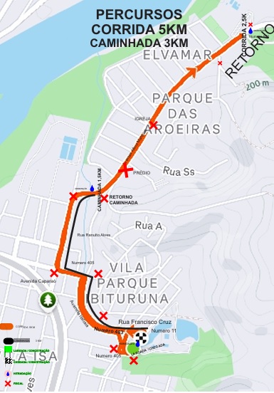 PERCURSO: Saindo de dentro do Aeté Clube, vira a direita pela rua Francisco Cruz a primeira a direita na Av. Itatiaia beira córrego até a ponte e vira a esquerdaa na ponte Caparaó, vira a direita na Covep rua Ranunfo Álvares, segue até a curva entrada do bairro Elvamar após av. Altino Marques seguindo pela rua Altino Marques retornando ao clube.