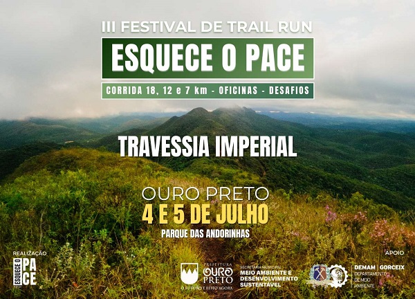 O Festival Esquece o Pace de Corrida em Trilhas acontece nos dias 04 e 05 de julho de 2026 no Parque Natural Municipal das Andorinhas em Ouro Preto, MG. A inscrição no Festival Esquece o Pace de Corrida em Trilhas dá ao inscrito direito a participação em uma das oficinas disponíveis, acesso a todas as palestras e participação em um dos percursos do Desafio Esquece o Pace. CONTATO DA ORGANIZAÇÃO: contato@esqueceopace.com.br SITE DO EVENTO: esqueceopace.com.br